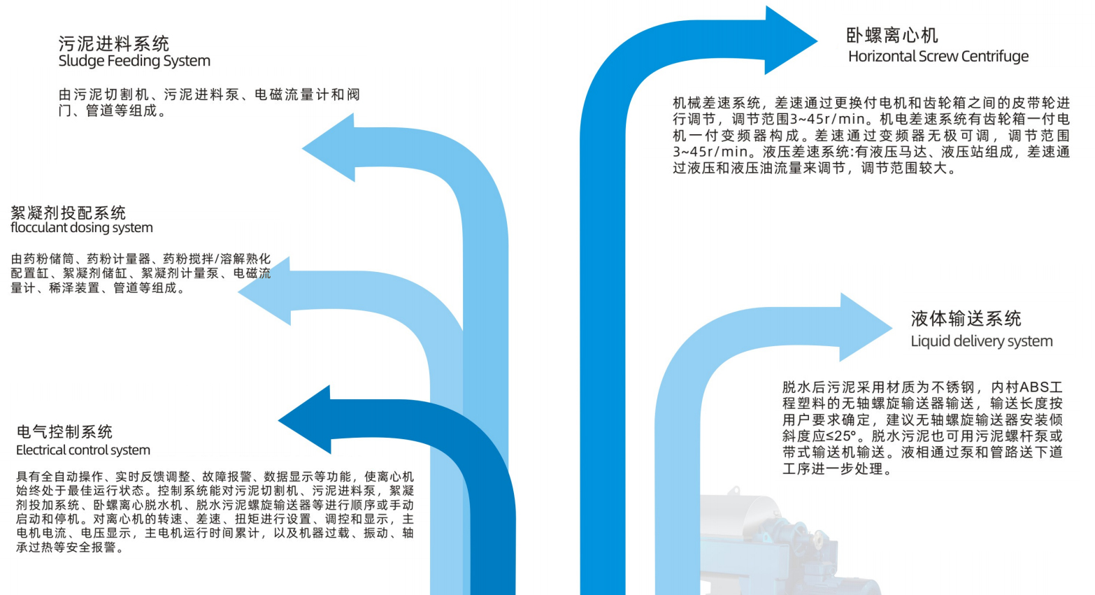 對(duì)不同物性的污泥,離心機(jī)可設(shè)置在不同的轉(zhuǎn)速、差速和扭矩或恒差速狀態(tài)下運(yùn)行,以保證液相澄清度,固渣干度及轉(zhuǎn)鼓內(nèi)物料不堵料。 |