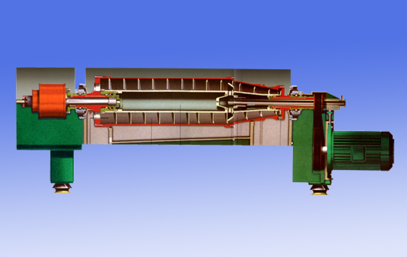 該機(jī)轉(zhuǎn)鼓由主電機(jī)帶動,變頻輔電機(jī)和齒輪箱(或液壓馬達(dá))構(gòu)成轉(zhuǎn)鼓和螺旋之間差速系統(tǒng),轉(zhuǎn)鼓和螺旋在同一軸線以不同轉(zhuǎn)速同向旋轉(zhuǎn),懸浮液通過固定的進(jìn)料管,經(jīng)螺旋出料口進(jìn)入轉(zhuǎn)鼓,在高速旋轉(zhuǎn)的離心力作用下,比重較大的固相顆粒沉降到轉(zhuǎn)鼓內(nèi)壁,在螺旋差 速的作用下,不斷將沉降在轉(zhuǎn)鼓內(nèi)壁上的固相顆粒刮下并推向轉(zhuǎn)鼓小端,從排渣口排出,比重較小的液相在轉(zhuǎn)鼓內(nèi)形成內(nèi)層液環(huán),沿螺旋槽不斷被澄清流向轉(zhuǎn)鼓大端,從口徑可調(diào)的溢流堰板口溢出,從而實現(xiàn)了固液二相或三相分離。轉(zhuǎn)鼓轉(zhuǎn)速、轉(zhuǎn)鼓和螺旋之間的差速,根據(jù)分離物料特性進(jìn)行無級可調(diào)。